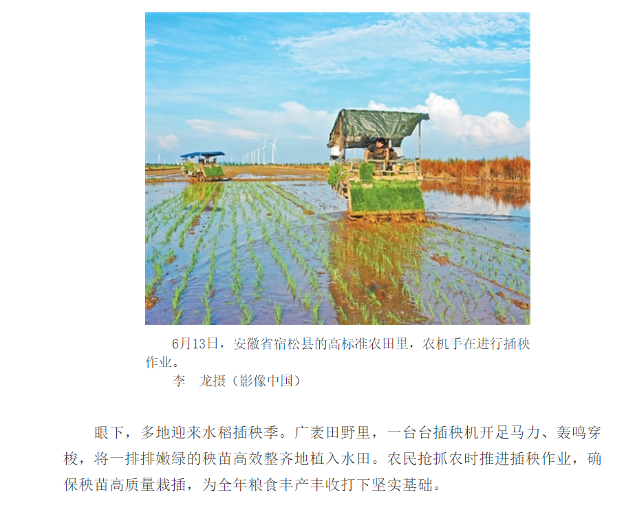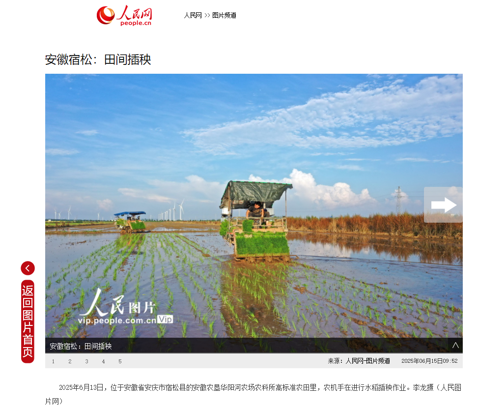 6月15日《人民网》首页和6月16日《人民日报》首版相继报道了安徽农垦华阳河农场夏种机插秧情况。
