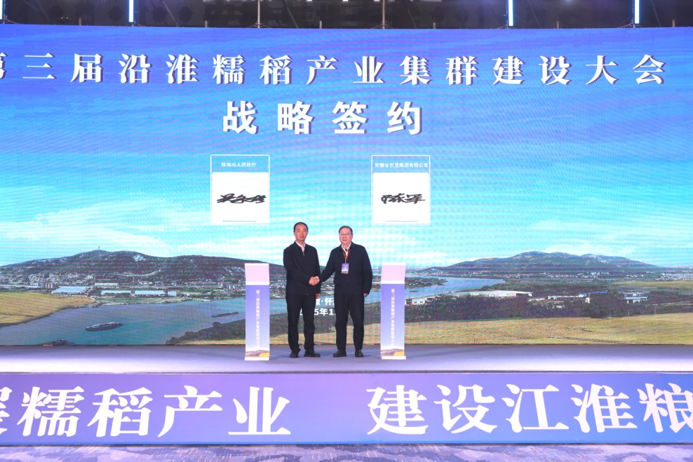 11月4日,第三届沿淮糯稻产业集群建设大会在蚌埠市怀远县召开。本次会议主题是“发展糯稻产业,建设江淮粮仓”。会上,垦地合作共建的“安徽省江淮粮仓研究院蚌埠分院”“‘1+5’农业科技创新联盟蚌埠分中心”揭牌,农垦集团与蚌埠市政府签订战略合作协议,会上签订了龙亢农场中央厨房配送供应链项目等10个产业项目。