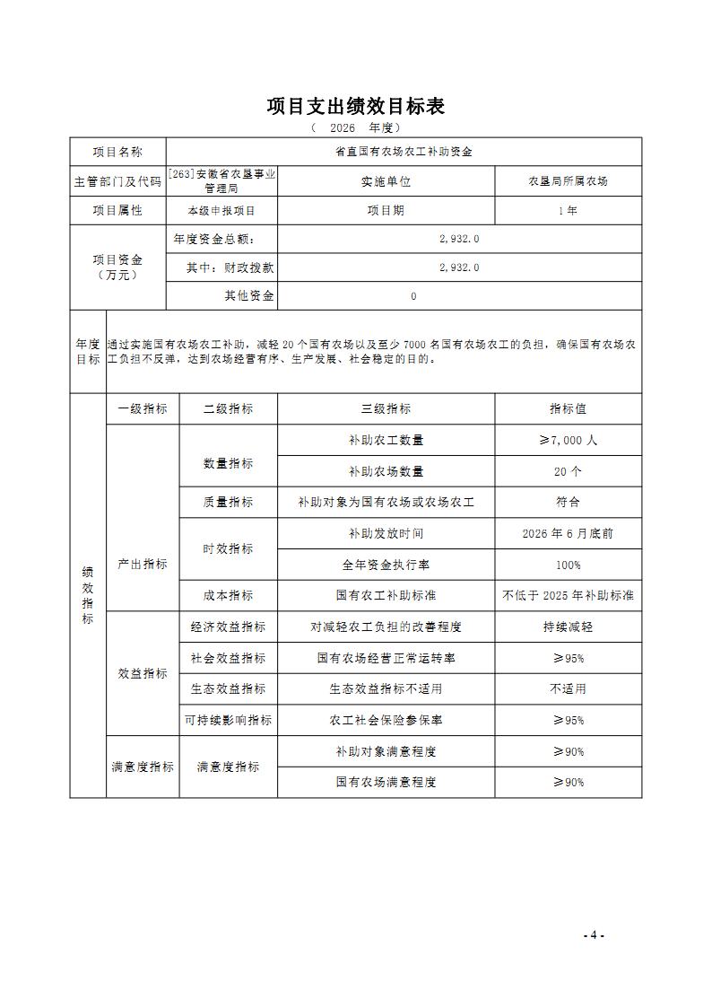 安徽省农垦事业管理局2026年部门预算批复的其他项目绩效目标