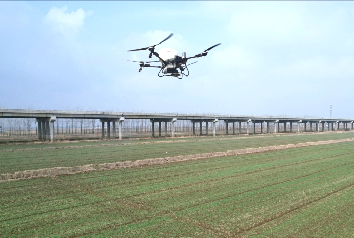 ▲阜蒙农场利用植保无人机开展小麦施肥作业(王雅雯 苑玉琪 摄)
